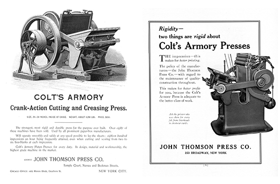 Thomson was most likely delighted to see his nemesis go down in flames in a New York courtroom. And between 1886 and 1902, John Thomson would remain employed at Colt. By May 1, 1902, Thomson succeeded in purchasing the complete press-manufacturing division from Colt and relocated the business to Long Island City, N.Y., where a new factory was completed in 1906. Several models were supplied and generally for printing. The Universal design's robustness also established an unexpected opportunity in the rapidly growing paper-box industry, where the platen proved superior to all others.